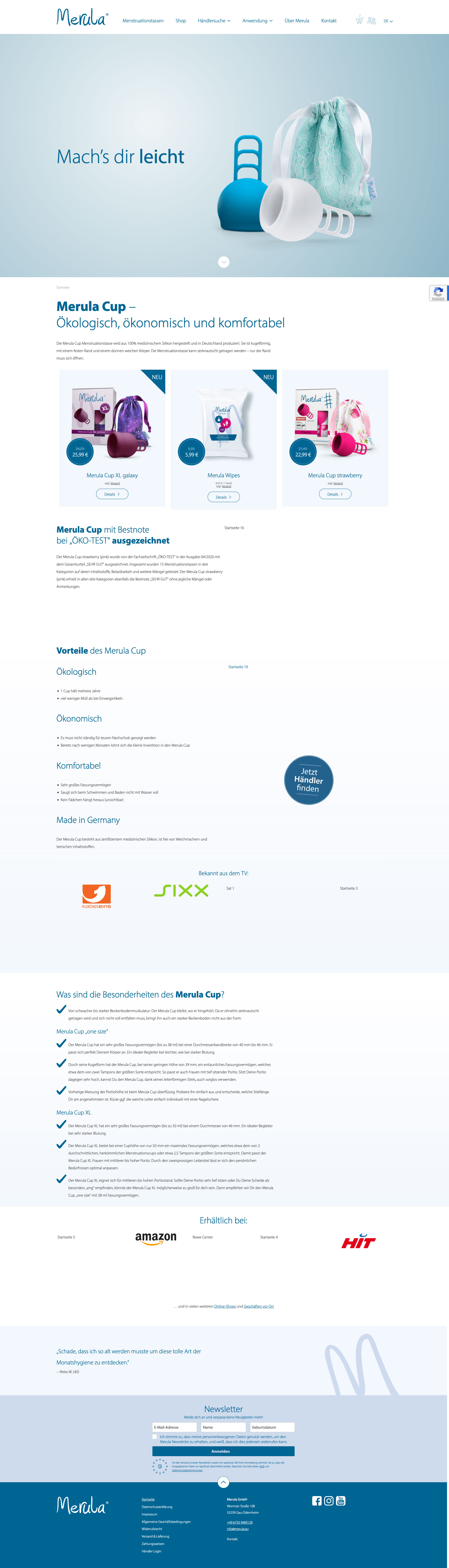 Um die fortschrittlichen Hygieneartikel von Merula optimal zu präsentieren, braucht es ein modernes wie ansprechendes Marketingkonzept. Umgesetzt haben wir das mit einer klar strukturierten Website, attraktiven Produktbildern und Werbefilmen, die Aufmerksamkeit erzeugen und dazu beitragen, die Monatsblutung endlich aus der Tabu-Ecke zu holen.